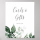 This emerald greenery cards and gifts sign is perfect for a boho wedding or bridal shower. The elegant yet rustic design features moody dark green watercolor leaves and eucalyptus with a modern bohemian woodland feel. The line of text at the bottom of the sign can be personalized with the date, the names of the bride and groom, or a short message like "Thank you". This sign can be used for a wedding or any event or party.
