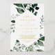 This emerald greenery gold foil all in one wedding invitation is perfect for a boho wedding. The elegant yet rustic design features moody dark green watercolor leaves and eucalyptus with a modern bohemian woodland feel. Featuring gold foil text on the front. Save paper by including the details on the back of the wedding invitation instead of on a separate enclosure card. Include the RSVP info as well if your guest will be replying electronically (optional).