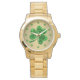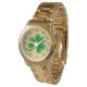 Unisex oversized gold bracelet watch with an image of an emerald shamrock on brushed gold and an emerald clock face. See matching acrylic photo sculpture pin, round charm, acrylic photo sculpture keychain and round necklace, See the entire St. Patrick's Day Watch collection under the ACCESSORIES category in the HOLIDAYS section.