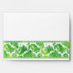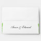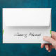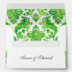 The combination of minimalist textured background with an intricate, shimmering, bright emerald green damask border, like bright spring greenery dappled by the sun, and inside lining sets this envelope apart. The striking floral damask sweeps and curls lavishly up to a diamond-studded edge. On the back of the envelopes are the couple's names in script font - this is optional, and completely customisable by you.
