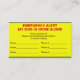 This business card is imprinted with the text Emergency Alert: My Dog is Home Alone.  It provides a place to add contact names or phone numbers of people that will care for your dog if you are injured or incapacitated.  The card is designed to be carried in your wallet and can be customised by filling in the names and phone numbers.  It is perfect for the dog owner to plan ahead in so emergency personnel will carry out your wishes.
