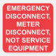 A sheet of six, 3" x 3" EMERGENCY DISCONNECT, METER DISCONNECT, NOT SERVICE EQUIPMENT sticker labels for electricians to use to satisfy the requirements of Article 230.85(E)(1) and (2) in the 2023 National Electrical Code.