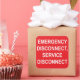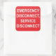 A sheet of six, 3" x 3" EMERGENCY DISCONNECT, SERVICE DISCONNECT sticker labels for electricians to use to satisfy the requirements of Article 230.85(E)(1) and (2) in the 2023 National Electrical Code.