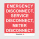 An EMERGENCY DISCONNECT, SERVICE DISCONNECT, METER DISCONNECT sticker label to help electricians satisfy the requirements of Article 230.85(E)(1) and (2) in the 2023 National Electrical Code.