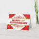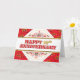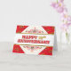This is a strikingly eye-catching Employee 10th Anniversary Card featuring the text 'HAPPY 10th ANNIVERSARY' on a rectangular white background with dark grey and digitally simulated gold foil effect borders. The words 'HAPPY ANNIVERSARY' are overlaid with a bright red, orange and dark grey pattern, and the '10th' is overlaid with the same digitally simulated gold foil effect as the border. Behind this is a white octagon with decorative elements above and below the central text and a fine digitally simulated gold foil effect border. The background consists of a red, orange and dark grey pattern.