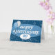 This is an Employee 20th Anniversary card in blue featuring the centrally placed text 'Happy Anniversary' written in white in an attractive font and set against a pale blue, oval shaped, text box. Underneath this text is the number of years. To the left of the text are a couple of balloons, one pale grey and one blue, with the effect that they are anchored by their strings being wrapped around the swish of the first 'A' of Anniversary. The background is in a darker blue with a light coloured circular and stars pattern.