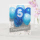 This is an Employee 5th Anniversary card featuring a colour photographic image of blue balloons. On one of the balloons is the number 5. There is also digitally simulated colourful confetti. In the lower section of the card, is the text 'Congratulations!' written at a jaunty angle over a grey text box.