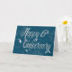 This is a fun six year Employee Anniversary Card featuring the text 'Happy 6th Anniversary', written in a swirly font with a digitally added silver foil effect overlay. The text is set against a blue background with a feint swirly pattern. In addition, there are three star bursts each of which has a digitally added silver sparkle effect. All in all a fun, bold and celebratory design.