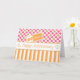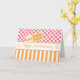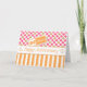 A fun, colourful fifteen years employee anniversary card with a bold summer fresh vibe. There is a large pink polka dots on white pattern in the top half; some of the polka dots have a gold sparkle effect overlay, and a bold, orange and white vertical stripes pattern, with the addition of decorative interspersed thin gold sparkle effect vertical lines, in the bottom half.