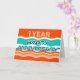 This is a brightly coloured Employee 1st Anniversary card in red, orange and jade featuring waves of colour and the text, HAPPY ANNIVERSARY in a fun stripy, flowing font. At the top is the text 1 YEAR, in a contrasting, plain, bold font with orange and white patterned detail.