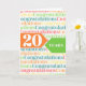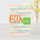 This is a colourful Employee Anniversary 20 Years Congratulations card. The background congratulations pattern features the repeated word 'Congratulations' written in red, orange, yellow, green and jade against a white background. The text '20 YEARS' is written on two centrally placed point tipped labels, one in orange and one in green, with a drop shadow to give the illusion of the labels standing out from the background.