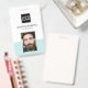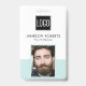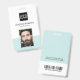 Personalised business company ID badge featuring a pastel teal and white background, a photo of the employee, your company logo, name, barcode and profession.