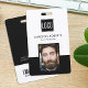 Personalised business company ID badge featuring a stylish black and white background, a photo of the employee, your company logo, name, barcode and profession.