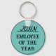 Create your own funny keychain. Employee of the year write name on blue key chain. Simple design boss gift.