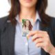 A simple design features an employee photo badge with name and title, perfect for company corporate, custom security, perfect for business personnel staff, with a barcode bar QR code, standard office supplies, with a simple minimalist black and white background, basic clean, trade show event.