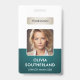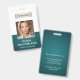 A modern and elegant corporate ID badge designed in a deep green colour palette. Easily customisable with an employee photo, name, job title, company logo, and other business details. The layout features clean typography for a professional and clear appearance, ensuring easy identification. This ID badge is available with options for a lanyard, metal clip, or retractable holder. No minimum order required.