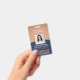 **Please note that the background is printed to look metallic, but the product is not made of metal and is not foil.** Represent your business in style by supplying staff with with modern and professional identification badges. The Logo, photo, bar code and all wording on this template are all simple to customise. The design features a faux metallic copper background with an elegant navy blue curved arc, your company logo, one square picture, employee name and title, and UPC / barcode on back. It can provide organisation and security for company staff, while presenting the corporate branding with a stylish classic appearance. Please note that copper is printed colour, not metallic foil.