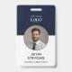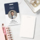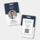This employee id badge provides a modern and professional identification solution for professionals. The two sided vertical design features a circular photo placeholder with a refined gold frame set against a crisp white chevron background and a solid navy blue base. This badge supports clear identification within high tech office environments and corporate headquarters.