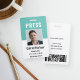 Personalise these vertical press pass badges with an employee photo and name, along with three lines of additional custom text for title or role, media outlet, and valid through date. PRESS appears at the top in bold white lettering. Additional custom text field located on the back for return information or other details, as well as a template for a barcode or a QR code.
