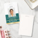 Create a professional appearance with this personalised staff identification badge. A simple and stylish template with your ID photo, name, job title, employee number, company logo, and scannable QR code. All the text can be customised or deleted to suit your business needs. This elegant design would suit many different workplaces and professions, including retail salespersons, restaurant and foodservice employees, office staff, small businesses, conference name tags and more! Printed colours: teal green and white with a gold gradient.