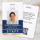 Create a professional appearance with this personalised staff identification badge. A simple and stylish template with your ID photo, name, job title, employee number, company logo, and scannable QR code. All the text can be customised or deleted to suit your business needs. This elegant design would suit many different workplaces and professions, including retail salespersons, restaurant and foodservice employees, office staff, small businesses, conference name tags and more! Printed colours: dark blue navy and white with a gold gradient.