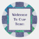 This employee welcome sticker features a sophisticated and professional star pattern with a large pale blue square in the centre to provide the background for your text. The star design displays a tiled mosaic green and blue design against a light blue grey background which can be customised if you desire. The words "Welcome To Our Team" appear in the centre and can easily be personalised.