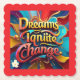 A vibrant design featuring the text "Dreams Ignite Change" in a dazzling array of colours, accented with golden touches that shimmer like stars. The bold typography is surrounded by abstract shapes and swirling patterns, symbolising the energy and potential of creativity. This piece inspires viewers to embrace their aspirations and transform them into reality."Original Image was generated by Meta AI. AI generated artwork. Licensed under CC BY-SA 4.0.