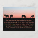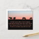 This sympathy postcard, for the loss of a horse features, a pasture with horses grazing, with the centre horse missing. This card is designed for you to customise it with the name of the horse and putting your own message on the back side. For an Equine sympathy card or to give with a horse loss gift.