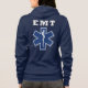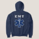 D. On the front of the shirt is "EMT" above a blue star of life and on the back is the same EMS rescue symbol in a larger size.