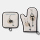 This oven mitt and potholder set features realistic style illustrations of emus. There are two emus on the oven mitt and a third one on the pot holder. The pot holder also has a spot for you to add a name or your own custom message in blue lettering.