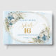 Create a beautiful keepsake for an unforgettable milestone with this elegant Sweet Sixteen guest book / sign-in book, designed in a refined watercolor style. Featuring dusty blue florals blended with soft greenery and accented by shimmering gold glitter details, this guest book sets the perfect tone for a sophisticated Sweet Sixteen, Sweet 16th, or 16th birthday celebration.