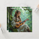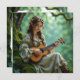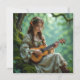 A mystical ethereal card featuring an elven fairy in vintage dress playing a ukulele sitting on a tree branch.