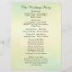 Tasteful wedding ceremony program designed on a soft blue, green and cream watercolor background and deco swirl pattern in dark grey text lettering. Accented with a simple white wedding lantern in the background. Double sided design with ceremony on front and bridal party details and thank you text on the back. All text is formatted and ready for you to simply replace or remove where needed in the "Personalise this template" button. You can customise further in that bottom link. Coordinates with the formal invitation and a whole wedding stationery collection at Monograms and Monikers on Zazzle. More items shown with this design.