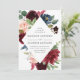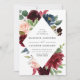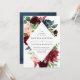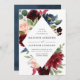 Elegant floral wedding invitation displays your names and wedding details framed by rich burgundy, blush pink, and navy blue watercolor flowers complimented by lush green foliage. The reverse side of the invites features an optional navy blue watercolor background.