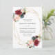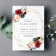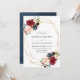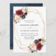 Elegant floral wedding invitation displays your wedding details surrounded by a faux gold foil frame with bouquets of rich burgundy, blush pink, and navy blue watercolor flowers and lush green foliage. The reverse side of the invites features an optional navy blue watercolor background.