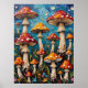 This painting offers a whimsical close-up view of a forest floor teeming with colourful mushrooms. The artwork features a heavy impasto texture, with thick, distinct brushstrokes that give each mushroom a sculptural form. A variety of mushroom species are depicted, showcasing caps in vibrant shades of red, orange, and blue, many adorned with white spots. Small flowers and lush green foliage fill the deep blue background, creating a magical and slightly surreal scene.