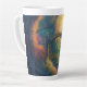 Artistic latte mug features an AI generated digital art image of a magical forest garden gate with sun ray beaming in background.