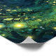 Mystical enchanted forest scene at night bathed in soft magical glow. Lush dark green woods filled with tiny sparkling fireflies forming a luminous archway and scattered trails of golden light.