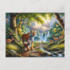 A vibrant and lush forest scene filled with wildlife and serene beauty. To the left, a majestic tiger leads her cub along a path adorned with fallen leaves. In the background, a group of graceful deer stands amidst the trees, one raising its head towards the sunlight filtering through the foliage. A stunning waterfall cascades down rocks, forming a gentle river that winds through the landscape. Birds of various hues perch on branches and fly overhead, adding splashes of colour to the enchanting setting. The sky transitions from warm golden hues to deep blue, illuminating the entire scene with a magical glow.