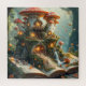 A magical scene featuring fairies in a forest with a mushroom-shaped house, a cascading waterfall, and a musical performance creating an enchanting atmosphere amidst detailed natural surroundings.