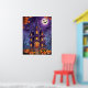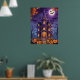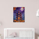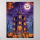 Step into a world of spooky enchantment with this whimsical illustration of a haunted house. Perfect for Halloween, this artwork features a tall, narrow house with exaggerated gothic architecture, set against a night sky illuminated by a full moon. Bats flutter around, while bare trees and jack-o’-lanterns add to the eerie atmosphere. The fallen autumn leaves complete this captivating scene, making it an ideal addition to your Halloween decor.