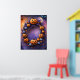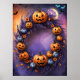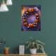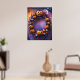 Add a touch of magic to your Halloween decor with this enchanting poster. Featuring a beautifully crafted wreath made of purple and blue branches, adorned with glowing orange and blue pumpkins, this artwork captures the spooky yet festive spirit of Halloween. The full moon, flying bats, and scattered autumn leaves in the background enhance the eerie atmosphere, making it a perfect addition to your seasonal decorations.