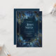 Transport your guests to a magical starlit grove with this ethereal and atmospheric design. The composition features translucent midnight blue foliage illuminated by shimmering gold veins and a delicate sprinkle of glowing celestial dust. Set against a deep, velvety dark backdrop, the luminous leaves appear to float within a crisp, minimalist gold frame, creating a sense of wonder and mystery. The high-contrast palette of navy and metallic yellow evokes a feeling of "dark academia" luxury and starlit romance, perfect for a high-end evening celebration. This is a wedding invitation designed for formal evening ceremonies, enchanted forest celebrations, or winter solstice events held under the stars.