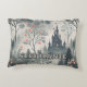 This fantastical scene throw pillow features a dark, towering castle with glowing windows nestled in a misty forest of blue and grey tones. Surrounded by slender evergreens, bare-branched trees, and soft blossoms in pink and orange, the landscape shimmers with subtle specks of magical light. The twilight ambiance and ethereal details create a whimsical, mysterious atmosphere, perfect for lovers of fantasy, fairytales, and dreamlike forest settings.