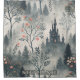This fantastical scene shower curtain features a dark, towering castle with glowing windows nestled in a misty forest of blue and grey tones. Surrounded by slender evergreens, bare-branched trees, and soft blossoms in pink and orange, the landscape shimmers with subtle specks of magical light. The twilight ambiance and ethereal details create a whimsical, mysterious atmosphere, perfect for lovers of fantasy, fairytales, and dreamlike forest settings.