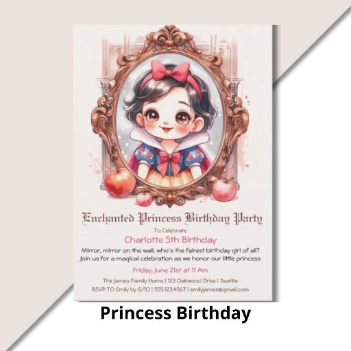Invite your little princess’s friends to a magical birthday celebration inspired by Snow White! 🎂👑 With a fairy tale design featuring royal elegance, red and gold details, and a touch of sparkle, this invitation is perfect for a princess-themed birthday party. Personalise it with your event details and let the fairy tale begin! ✨🎈