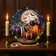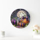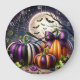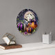 This unique Halloween clock face features a vibrant scene with several pumpkins of varying sizes and patterns. A large pumpkin with a purple and black striped pattern stands beside a taller, orange pumpkin adorned with a festive purple and green ribbon. A smaller plaid pumpkin sits in the foreground. The background shows a full moon, with bats flying across it and a spooky spiderweb hanging from a gnarled tree branch. The clock hands are black and point to numbers that are surrounded by colourful, stylised swirls and vines.