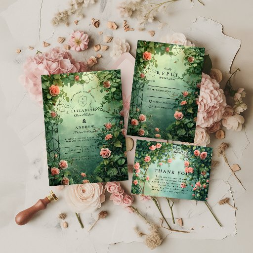 A richly detailed vintage garden design framed with blooming roses, wrought-iron scrollwork, and an ethereal patina background. The artwork creates a romantic, storybook atmosphere while keeping the layout elegant and timeless. Perfect for couples who want a dramatic, botanical aesthetic with a touch of historical charm. Your personalization becomes the centerpiece of this ornate garden vignette, making it ideal for classic, formal, or enchanted-garden events.