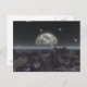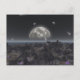 Digital illustration of an alien planet with a moon over an ocean and a meteor shower.