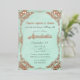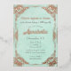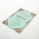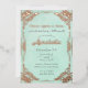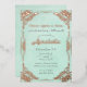 This enchanting custom invitation features a beautiful fairy tale theme. The background is a faded teal paper pattern that resembles the pages of an old book. An ornate, shiny antique frame of real rose gold borders the invitation. The iconic enchanted fairytale phrase "Once upon a time" is printed in a matching rose gold foil.